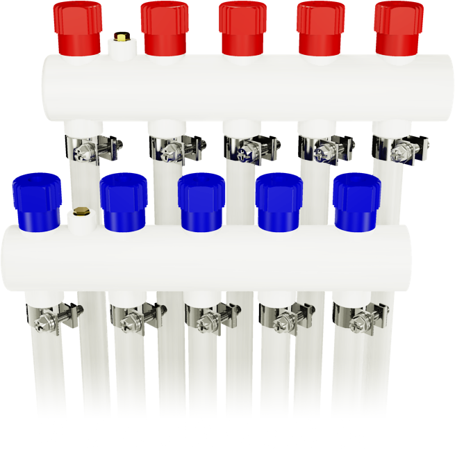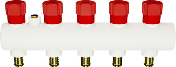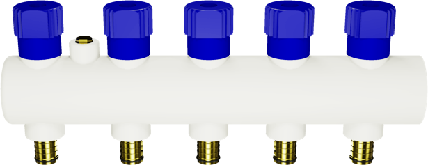 5 Ağızlı Turbo PPRC Kollektör, 5 farklı radyatöre veya yerden ısıtma sektörüne yapılacak dağıtımlarda, veya 4 ağız ile dağıtım yapılıp 1 ağzın boşaltma musluğu olarak bırakılacağı hallerde, devirdaim ısıtma suyu dağıtım ve toplama kollektörü olarak kullanılır.